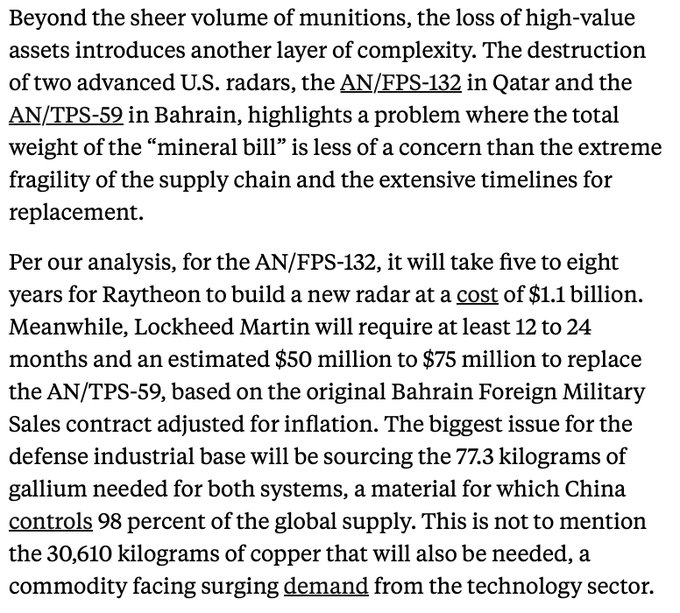 I don’t know if this is America’s last great war, I think there’s one more left, but it’s the war that shows how hollow the US has become. Can’t defend it’s bases. Can’t defend its allies. Can’t keep the trade routes open. Can’t build enough interceptors for a real war. Can’t replace destroyed radars and other infrastructure in any reasonable time span or without Chinese aid.