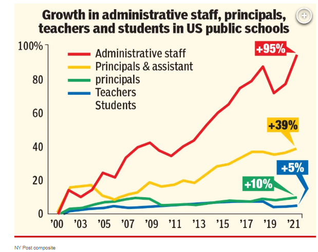 Most of those administrators spend their time denying care, not providing it. About a third should become technicians, nurses, orderlies and doctors, the rest aren’t needed at all. The same chart exists for schools: