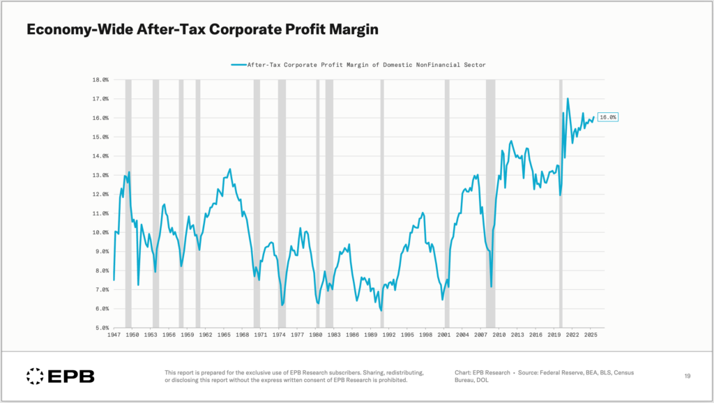 The entire US economy is being burned down. Those high profits aren’t a sign of health, they are a sign that excess profits are being taken at the expense of reinvestment in production and tech; of too high cost structures that make producing in America too expensive (because those profits indicate higher prices); of non-competitive markets, and, generally speaking, of burning down companies or the economy, or both, to make unsustainable profits.