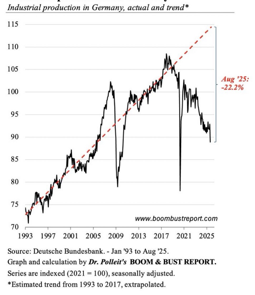 Europe is being ground between America and China, and ground to dust. The only way to avoid winding up third world nations (I am not being hyperbolic about this) is to get out from in between. All the GDP numbers are fake, they mean NOTHING of importance. All that matters is what you grow, dig up, refine and make. Everything else is nice to have, but ultimately if you can’t produce what you need, you are at the mercy of those who can. Germany, the industrial heart of Europe, is de-industrializing furiously. Everyone else’s industry was already gutted by Germany’s use of the Euro to inflate their costs and move production to Germany.